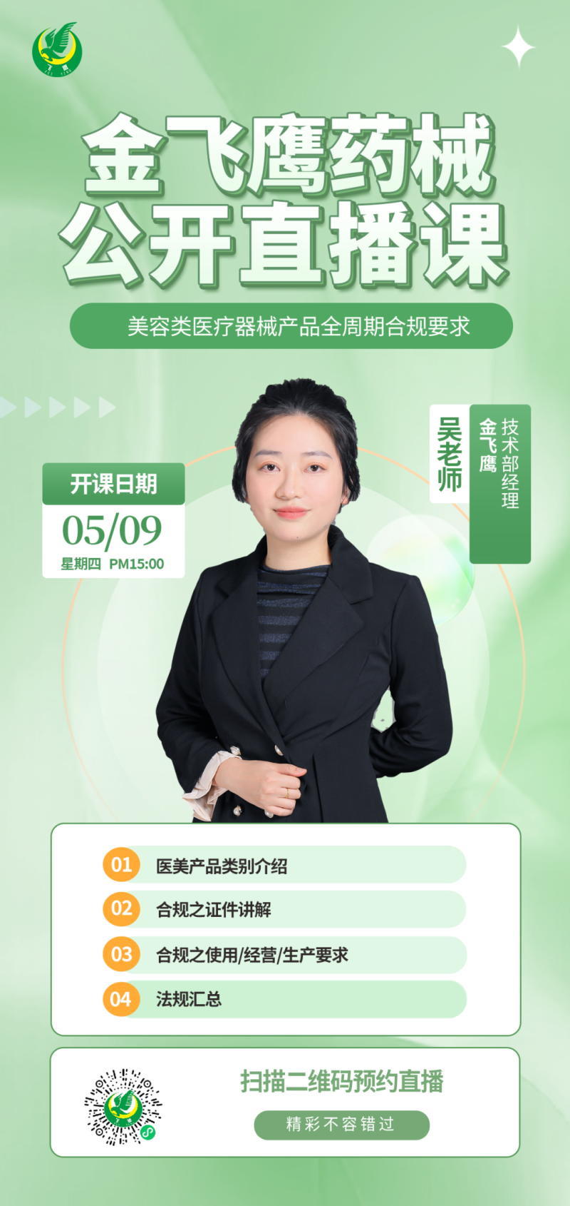5月9日下午3點,金飛鷹技術(shù)部經(jīng)理兼高級講師,有著近十年醫(yī)療器械行業(yè)工作經(jīng)驗,輔導(dǎo)過諸多有源醫(yī)美產(chǎn)品注冊的吳老師,給大家?guī)怼睹廊蓊愥t(yī)療器械產(chǎn)品全周期合格要求》,培訓(xùn)內(nèi)容包括醫(yī)美產(chǎn)品類別介紹、合規(guī)之證件講解、合規(guī)之使用/經(jīng)營/生產(chǎn)要求、法規(guī)匯總,相關(guān)企業(yè)千萬不要錯過了哦!