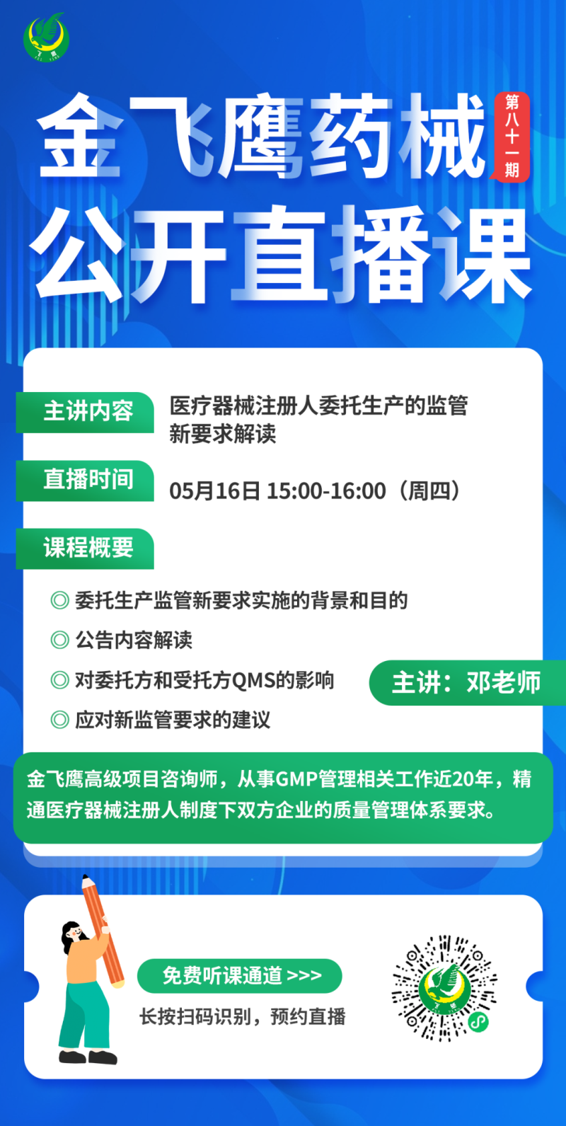 金飛鷹直播培訓(xùn),是每周一次的固定培訓(xùn)欄目,優(yōu)選金飛鷹國(guó)內(nèi)外資深注冊(cè)/項(xiàng)目老師定期為大家講解醫(yī)療器械注冊(cè)相關(guān)知識(shí),解答大家在醫(yī)療器械注冊(cè)過(guò)程中的諸多疑問(wèn)。
