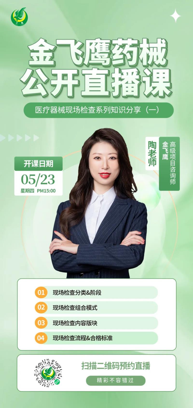 金飛鷹直播培訓,是每周一次的固定培訓欄目,優(yōu)選金飛鷹國內(nèi)外資深注冊/項目老師定期為大家講解醫(yī)療器械注冊相關知識,解答大家在醫(yī)療器械注冊過程中的諸多疑問。