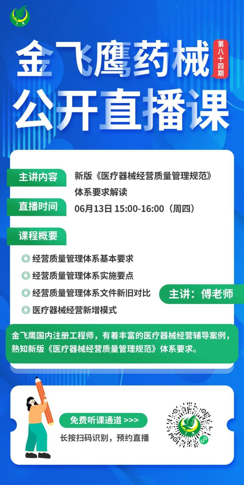 6月13日下午3點(diǎn),金飛鷹國(guó)內(nèi)注冊(cè)工程師,有著豐富的醫(yī)療器械經(jīng)營(yíng)輔導(dǎo)案例,熟知《規(guī)范》體系要求的傅老師,給大家?guī)?lái)《新版〈醫(yī)療器械經(jīng)營(yíng)質(zhì)量管理規(guī)范〉體系要求解讀》,培訓(xùn)內(nèi)容包括經(jīng)營(yíng)質(zhì)量管理體系基本要求、經(jīng)營(yíng)質(zhì)量管理體系實(shí)施要點(diǎn)、經(jīng)營(yíng)質(zhì)量管理體系文件新舊對(duì)比、醫(yī)療器械經(jīng)營(yíng)新增模式等,醫(yī)療器械經(jīng)營(yíng)企業(yè)千萬(wàn)不要錯(cuò)過(guò)了哦!