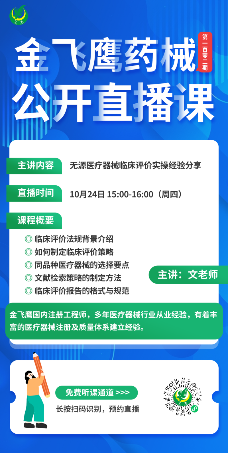 10月24日下午3點,金飛鷹國內(nèi)注冊工程師,有著豐富的醫(yī)療器械注冊及質(zhì)量體系建立經(jīng)驗的文老師,給大家?guī)怼稛o源醫(yī)療器械臨床評價實操經(jīng)驗分享,培訓(xùn)內(nèi)容包臨床評價法規(guī)背景介紹、如何制定臨床評價策略同品種醫(yī)療器械的選擇要點、文獻檢索策略的制定方法、臨床評價報告的格式與規(guī)想聽課的朋友記得提前預(yù)約哦!