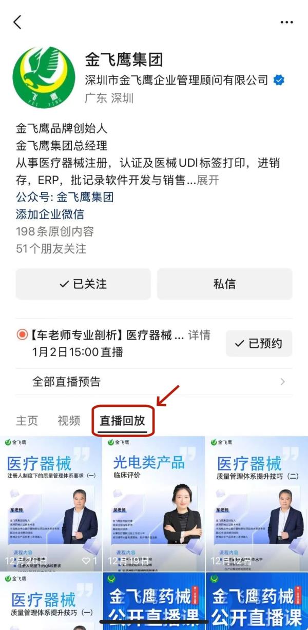 往期直播培訓(xùn)課程支持回放,關(guān)注“金飛鷹藥械咨詢(xún)服務(wù)”視頻號(hào)并點(diǎn)擊視頻號(hào)主頁(yè),即可查看“直播回放”哦~
