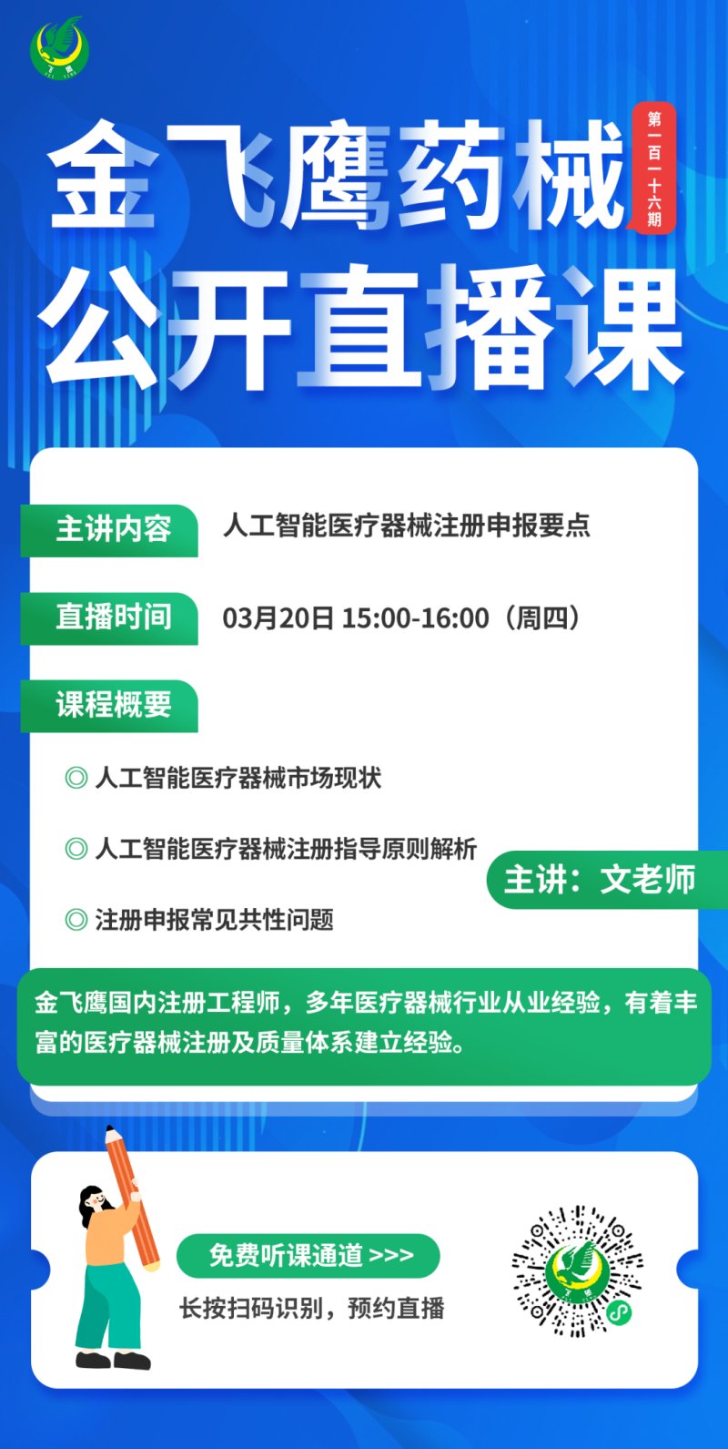 金飛鷹直播培訓(xùn),是每周一次的固定培訓(xùn)欄目,優(yōu)選金飛鷹國內(nèi)外資深注冊/項(xiàng)目老師定期為大家講解醫(yī)療器械注冊相關(guān)知識,解答大家在醫(yī)療器械注冊過程中的諸多疑問。