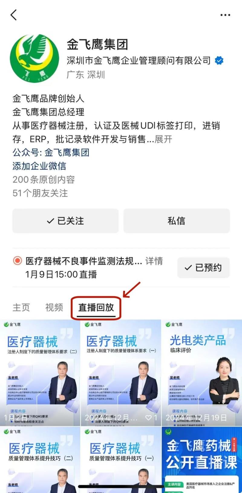 往期直播培訓(xùn)課程支持回放,關(guān)注“金飛鷹藥械咨詢服務(wù)”視頻號(hào)并點(diǎn)擊視頻號(hào)主頁(yè),即可查看“直播回放”哦~