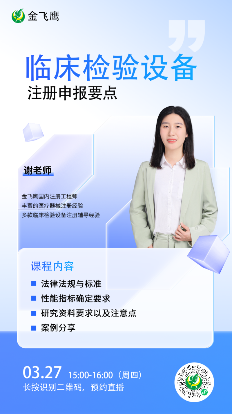 3月27日下午3點(diǎn),金飛鷹國(guó)內(nèi)注冊(cè)工程師、有著多款臨床檢驗(yàn)設(shè)備注冊(cè)輔導(dǎo)經(jīng)驗(yàn)的謝老師給大家?guī)?lái)《臨床檢驗(yàn)設(shè)備注冊(cè)申報(bào)要點(diǎn),培訓(xùn)內(nèi)容包括法律法規(guī)與標(biāo)準(zhǔn)、性能指標(biāo)確定要求、研究資料要求以及注意點(diǎn)、案例分享,從理論知識(shí)到落地實(shí)操,給大家全方位解讀此類產(chǎn)品注冊(cè)申報(bào)要點(diǎn)及難點(diǎn)。