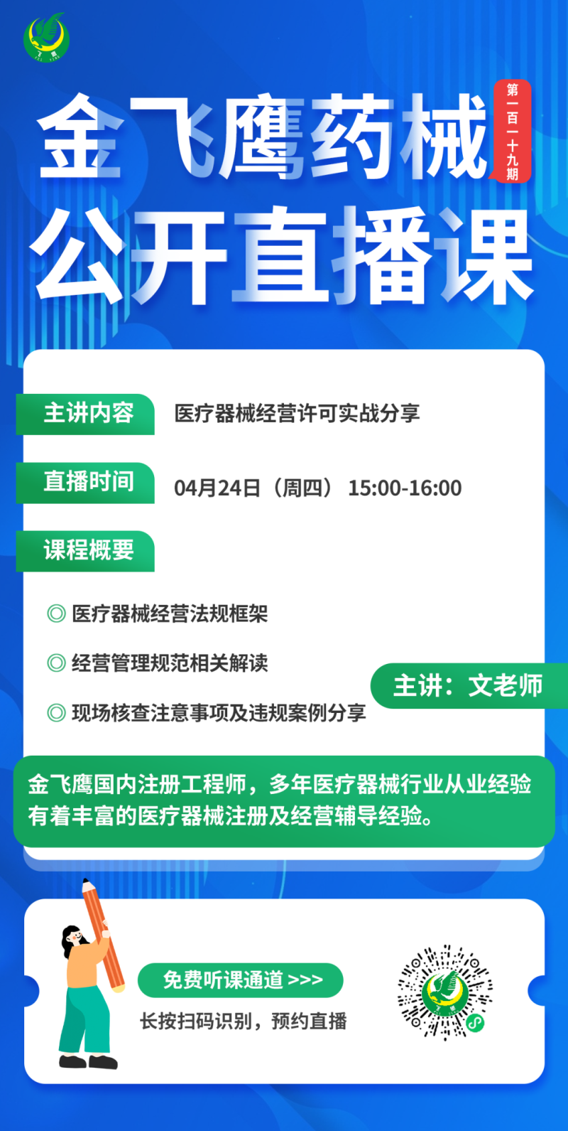 4月24日下午3點,金飛鷹國內注冊工程師、有著豐富醫(yī)療器械注冊及經驗輔導經驗的文老師給大家?guī)怼夺t(yī)療器械經營許可實戰(zhàn)經驗分享》,培訓內容包括醫(yī)療器械經營法規(guī)框架、經營管理規(guī)范相關解讀、現場核查注意事項及違規(guī)案例分享,結合他本身積累的豐富經營許可辦理經驗,從理論解讀到實操指導,全方位剖析醫(yī)療器械經營許可的申報要點與技巧。