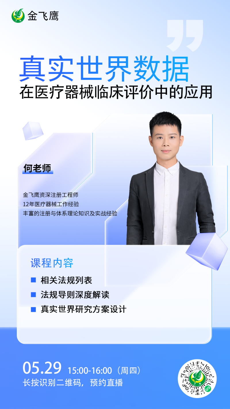 5月29日下午3點,金飛鷹資深注冊工程師、有著12年醫(yī)療器械行業(yè)從業(yè)經(jīng)驗的何老師給大家?guī)怼墩鎸嵤澜鐢?shù)據(jù)在醫(yī)療器械臨床評價中的應(yīng)用,他將立足法規(guī)要求,結(jié)合實戰(zhàn)案例,重點解析真實世界研究方案設(shè)計要點,為企業(yè)高效開展真實世界數(shù)據(jù)應(yīng)用提供專業(yè)指導(dǎo)。
