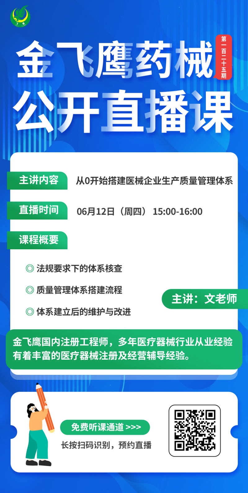 6月12日下午3點(diǎn)金飛鷹國(guó)內(nèi)注冊(cè)工程師、有著豐富醫(yī)療器械注冊(cè)及經(jīng)驗(yàn)輔導(dǎo)經(jīng)驗(yàn)的文老師給大家?guī)怼?/span>從0開始搭建醫(yī)械企業(yè)生產(chǎn)質(zhì)量管理體系,感興趣的朋友記得提前預(yù)約,我們直播間不見不散~