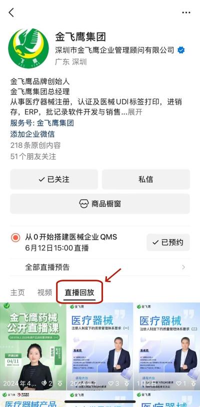 往期直播培訓(xùn)課程支持回放,關(guān)注“金飛鷹藥械咨詢服務(wù)”視頻號(hào)并點(diǎn)擊視頻號(hào)主頁,即可查看“直播回放”哦~