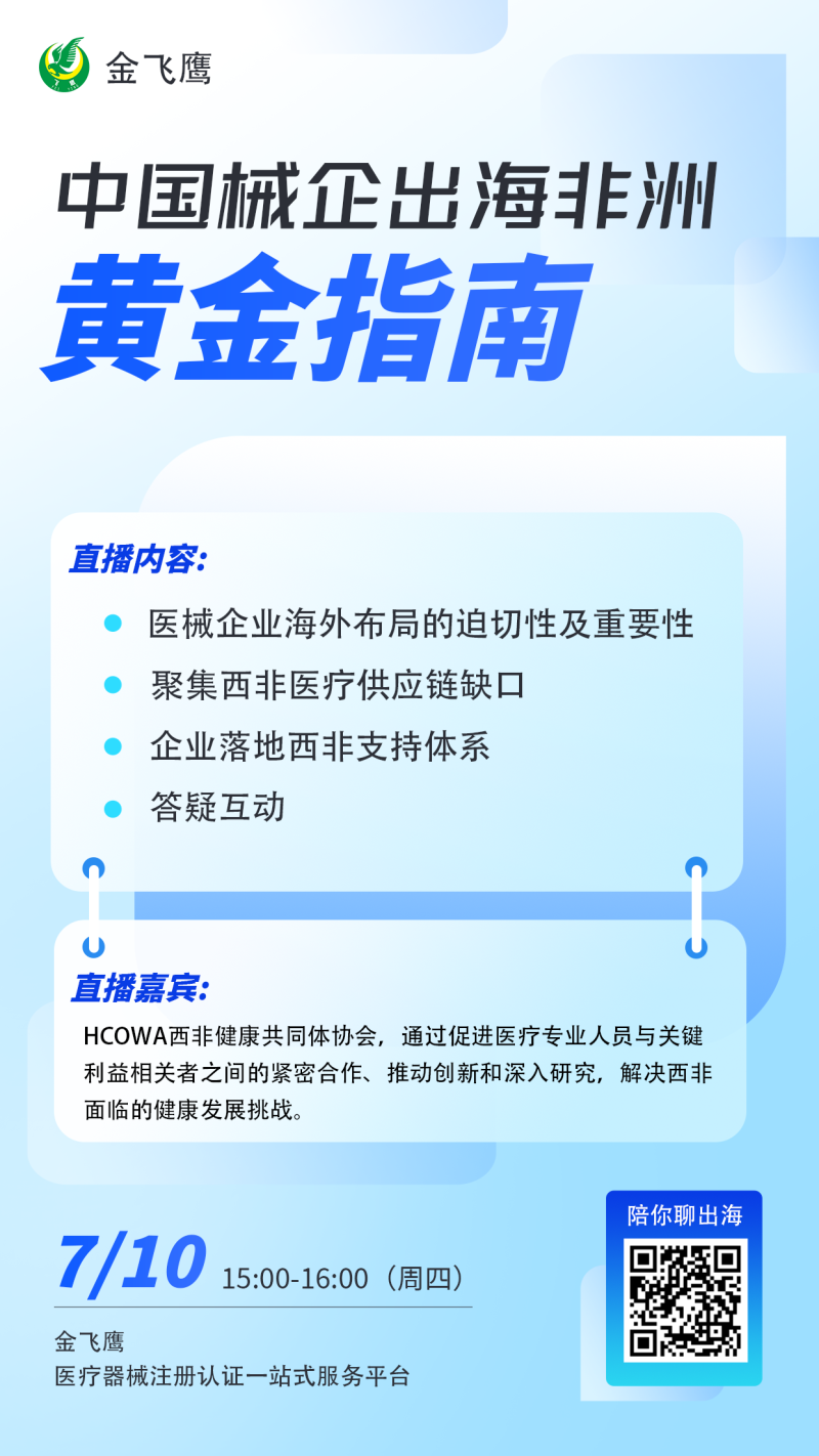 在此背景下,7月10日下午3點,我們特別聯(lián)合HCOWA西非健康共同體協(xié)會,給大家?guī)硪粓鲋袊灯蟪龊7侵拗改系闹辈ィ?/span>為您解鎖西非醫(yī)療市場的財富密碼!本期直播將從西非醫(yī)療市場需求、西非供應鏈缺口、企業(yè)落地西非的相關(guān)支持體系等方面進行分享,與各位共拓西非的掘金版圖,感興趣的朋友記得提前預約!