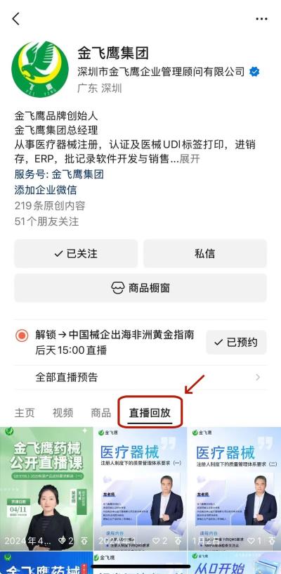 往期直播培訓課程支持回放,關(guān)注“金飛鷹藥械咨詢服務”視頻號并點擊視頻號主頁,即可查看“直播回放”哦~
