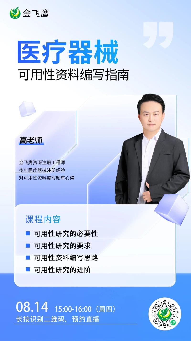8月14日下午3點(diǎn),金飛鷹資深注冊(cè)工程師,擁有多年醫(yī)療器械行業(yè)經(jīng)驗(yàn),對(duì)可用性資料頗有研究的高老師給大家?guī)怼?/span>醫(yī)療器械可用性資料編寫指南》,他將結(jié)合實(shí)際案例,詳細(xì)拆解可用性研究資料的編寫要素,為企業(yè)提供切實(shí)可行的指導(dǎo)建議,感興趣的朋友記得提前預(yù)約!