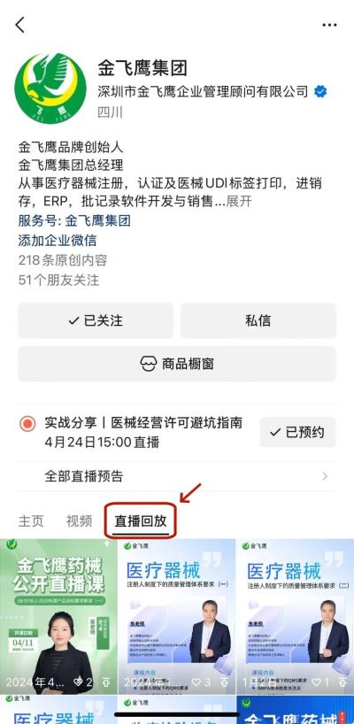 往期直播培訓(xùn)課程支持回放,關(guān)注“金飛鷹藥械咨詢服務(wù)”視頻號(hào)并點(diǎn)擊視頻號(hào)主頁,即可查看“直播回放”哦~