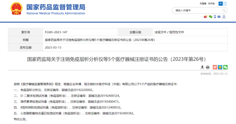 3月13日,國家藥監(jiān)局官網(wǎng)發(fā)布公告稱,按照《醫(yī)療器械監(jiān)督管理?xiàng)l例》規(guī)定,根據(jù)企業(yè)申請,注銷積水醫(yī)療科技(中國)有限公司的免疫層析分析儀5個產(chǎn)品的醫(yī)療器械注冊證,具體如下: