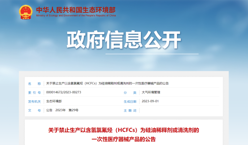 近日,國家生態(tài)環(huán)境部發(fā)布《關(guān)于禁止生產(chǎn)以含氫氯氟烴(HCFCs)為硅油稀釋劑或清洗劑的一次性醫(yī)療器械產(chǎn)品的公告》,具體內(nèi)容如下: