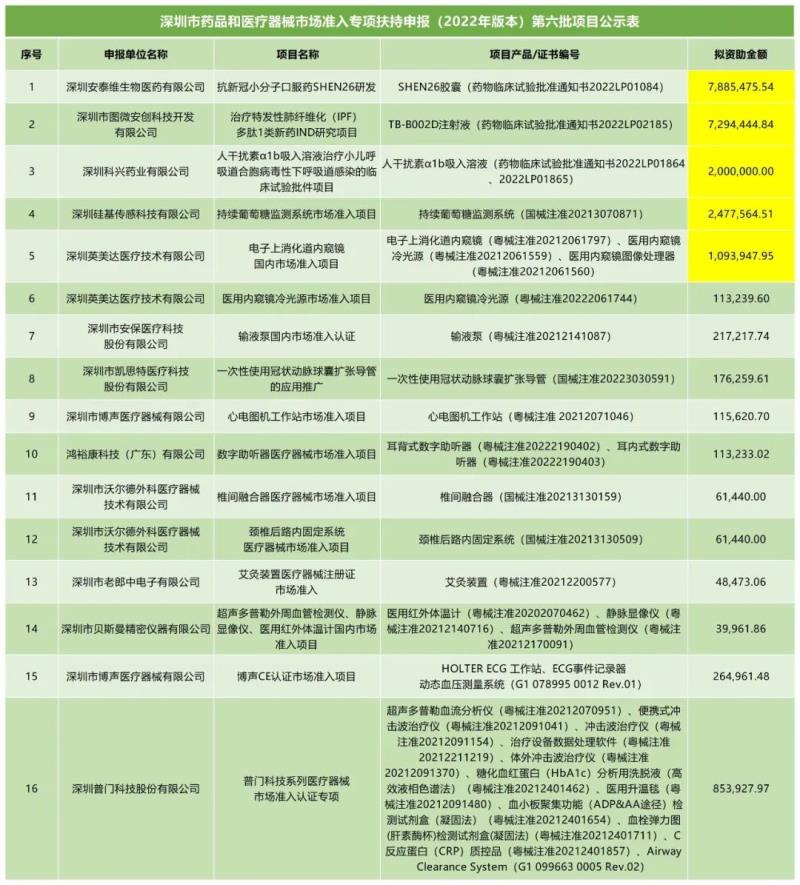 近日,深圳市發(fā)展和改革委員會官網發(fā)布《深圳市藥品和醫(yī)療器械市場準入專項扶持申報(2022年版本)第六批擬資助項目的公示》,包括深圳市貝斯曼精密儀器有限公司的超聲多普勒外周血管檢測儀/靜脈顯像儀/醫(yī)用紅外體溫計國內市場準入項目、深圳市沃爾德外科醫(yī)療器械技術有限公司的椎間融合器/頸椎后路內固定系統醫(yī)療器械市場準入項目、深圳市老郎中電子有限公司的艾灸裝置醫(yī)療器械注冊證市場準入等在內的共計16個項目,其中擬資助金額最高為788萬余元,而100萬元以上的共有5個項目(已用黃色標注),具體明細如下:
