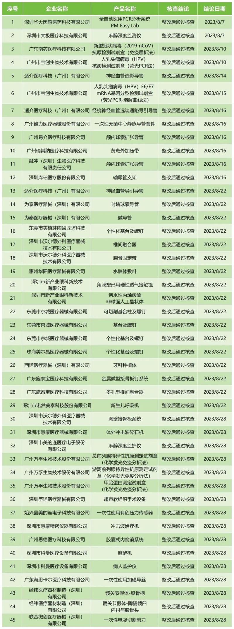 9月18日,廣東省藥監(jiān)局官網(wǎng)公布2023年8月醫(yī)療器械注冊質(zhì)量管理體系核查結(jié)果,包括深圳市沃爾德外科醫(yī)療器械技術(shù)有限公司、廣州萬孚生物技術(shù)股份有限公司、深圳市科曼醫(yī)療設(shè)備有限公司在內(nèi)的32家公司共計(jì)45款產(chǎn)品,均為“整改后通過核查”。具體明細(xì)見下方表格: