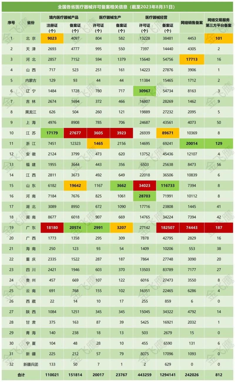 9月12日,國家藥監(jiān)局公布了截至2023年8月31日各省有效期內(nèi)醫(yī)療器械產(chǎn)品注冊(cè)備案、醫(yī)療器械生產(chǎn)企業(yè)許可備案等信息,老規(guī)矩,金飛鷹小編對(duì)此稍作編輯,標(biāo)注紅色、綠色、黃色的分別為前三甲。