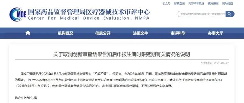 近日,國家藥監(jiān)局器審中心發(fā)布《關(guān)于取消創(chuàng)新審查結(jié)果告知后申報注冊時限延期有關(guān)情況的說明》,其中指出,自2023年10月1日起,取消因疫情影響創(chuàng)新審查結(jié)果告知后申報注冊時限延期的規(guī)定。該中心于2022年8月4日發(fā)布的共性問題《創(chuàng)新審查結(jié)果告知后申報注冊時限的相關(guān)情況說明》相關(guān)內(nèi)容(即“對于有充分證據(jù)證明確因疫情影響導(dǎo)致注冊申請延誤的項目,上述時限可適當(dāng)延長,最長不超過2年”)廢止,繼續(xù)執(zhí)行《創(chuàng)新醫(yī)療器械特別審查程序》(2018年83號)有關(guān)要求,創(chuàng)新醫(yī)療器械審查結(jié)果告知后5年內(nèi),未申報注冊的創(chuàng)新醫(yī)療器械,不再按照程序?qū)嵤彶椤?/strong>