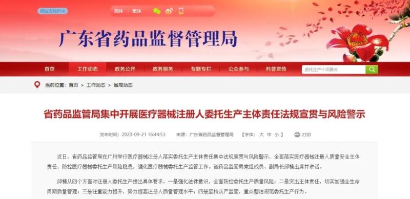 9月21日,廣東藥監(jiān)局官網(wǎng)發(fā)布動態(tài)稱,近日,該局在廣州舉行醫(yī)療器械注冊人落實委托生產(chǎn)主體責任集中法規(guī)宣貫與風險警示,全面落實醫(yī)療器械注冊人質(zhì)量安全主體責任,防控醫(yī)療器械委托生產(chǎn)風險隱患,強化醫(yī)療器械委托生產(chǎn)監(jiān)管工作。
