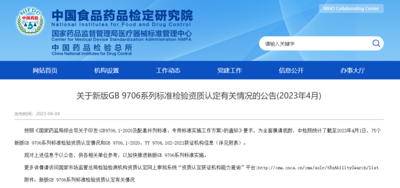 近日,中檢院官網(wǎng)發(fā)布《關(guān)于新版GB 9706系列標(biāo)準(zhǔn)檢驗(yàn)資質(zhì)認(rèn)定有關(guān)情況的公告(2023年4月)》(以下簡(jiǎn)稱《公告》),公布了截至2023年4月1日,75個(gè)新版GB 9706系列標(biāo)準(zhǔn)檢驗(yàn)資質(zhì)認(rèn)定情況和GB 9706.1-2020、YY 9706.102-2021獲證機(jī)構(gòu)信息(詳見文末附件),其中GB 9706.1-2020資質(zhì)認(rèn)定獲證機(jī)構(gòu)具體如下: