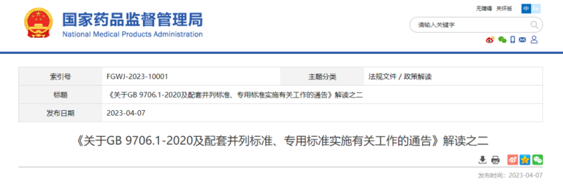 近日,國家藥監(jiān)局官網(wǎng)發(fā)布《關(guān)于GB 9706.1-2020及配套并列標(biāo)準(zhǔn)、專用標(biāo)準(zhǔn)實施有關(guān)工作的通告》解讀,進一步明確了新版GB 9706系列標(biāo)準(zhǔn)實施工作相關(guān)事項,具體內(nèi)容如下: