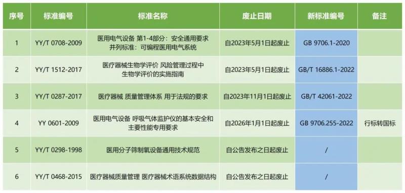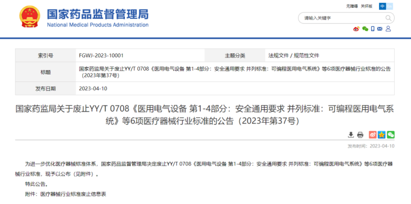 4月10日,國家藥監(jiān)局官網(wǎng)發(fā)布公告稱,廢止YY/T 0708-2009《醫(yī)用電氣設(shè)備 第1-4部分:安全通用要求 并列標(biāo)準(zhǔn):可編程醫(yī)用電氣系統(tǒng)》、YY/T 0287-2017《醫(yī)療器械 質(zhì)量管理體系 用于法規(guī)的要求》等6項行業(yè)標(biāo)準(zhǔn),在國家藥監(jiān)局發(fā)布的原有附件基礎(chǔ)上,我們加上了這幾項標(biāo)準(zhǔn)的新版替代標(biāo)準(zhǔn),具體如下: