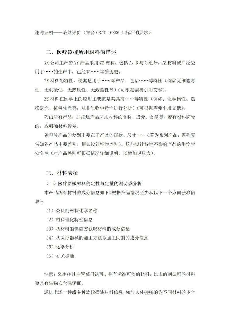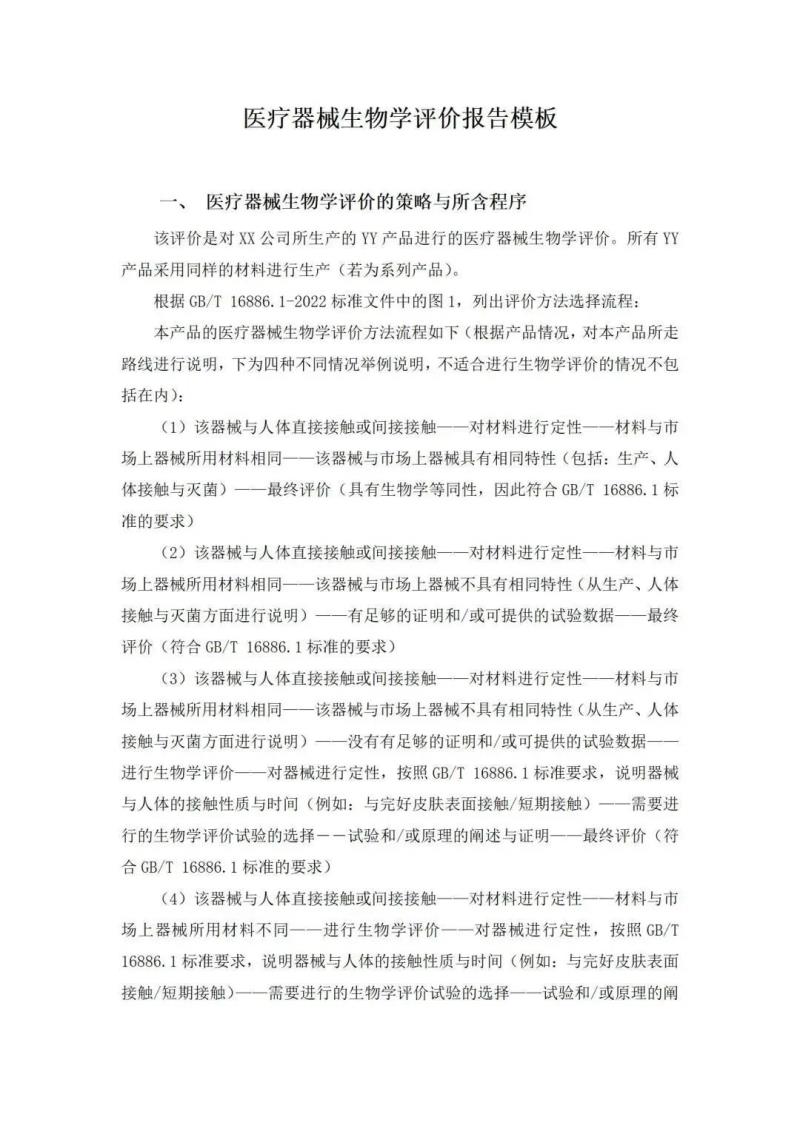 撰寫生物學(xué)評價報告時,可從醫(yī)療器械生物學(xué)評價的策略與所含程序、醫(yī)療器械所用材料的描述、材料表征、選擇或放棄生物學(xué)試驗的理由與論證、已有數(shù)據(jù)與試驗結(jié)果的匯總、完成生物學(xué)評價所需的其他數(shù)據(jù)、總結(jié)七個方面分別進(jìn)行闡述,我們將報告模板部分內(nèi)容展示如下: