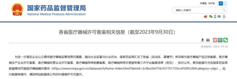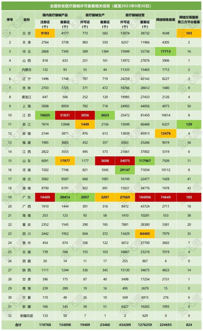 10月18日,國(guó)家藥監(jiān)局公布了截至2023年9月30日各省有效期內(nèi)醫(yī)療器械產(chǎn)品注冊(cè)備案、醫(yī)療器械生產(chǎn)企業(yè)許可備案等信息,老規(guī)矩,金飛鷹小編對(duì)此稍作編輯,標(biāo)注紅色、綠色、黃色的分別為前三甲。