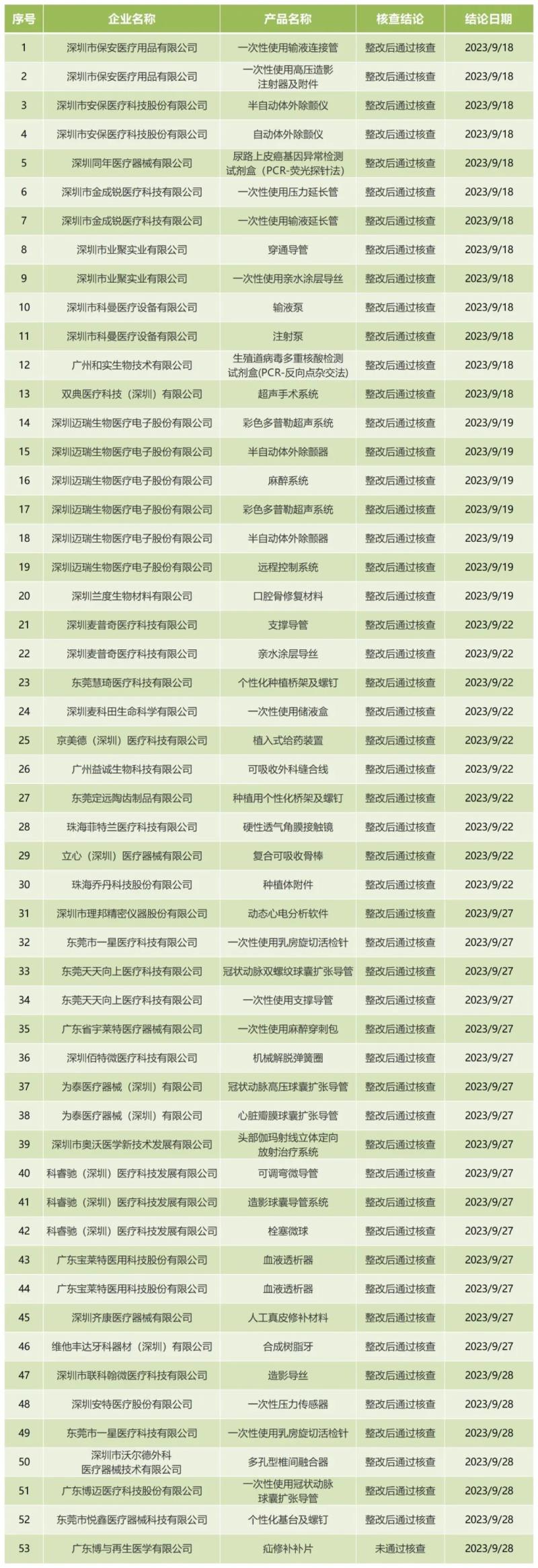 10月24日,廣東省藥監(jiān)局官網(wǎng)公布2023年9月醫(yī)療器械注冊質(zhì)量管理體系核查結(jié)果,包括深圳邁瑞生物醫(yī)療電子股份有限公司、深圳市金成銳醫(yī)療科技有限公司、深圳市科曼醫(yī)療設(shè)備有限公司在內(nèi)的36家公司共計(jì)53款產(chǎn)品,其中52款產(chǎn)品為“整改后通過核查”,有一款產(chǎn)品“未通過核查”。具體明細(xì)見下方表格: