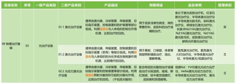 首先,用于醫(yī)美用途的激光產(chǎn)品都屬于《醫(yī)療器械分類(lèi)目錄》子目錄“09 物理治療器械,其分類(lèi)編碼為09-03-01及09-03-02。激光醫(yī)美產(chǎn)品產(chǎn)品描述、預(yù)期用途如下: