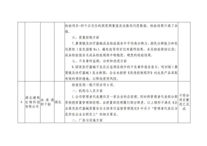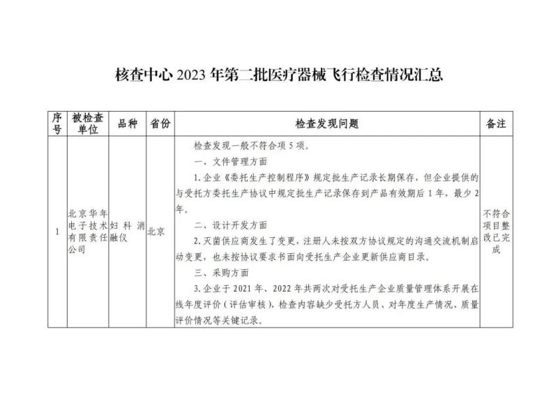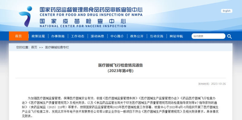 10月26日,國(guó)家藥監(jiān)局食品藥品審核查驗(yàn)中心官網(wǎng)發(fā)布《醫(yī)療器械飛行檢查情況通告(2023年第4號(hào))》,該通告指出,核查中心于2023年4-5月對(duì)北京華年電子技術(shù)有限責(zé)任公司、湖北健帆生物科技有限公司、深圳市正生技術(shù)有限公司等10家企業(yè)組織開(kāi)展了醫(yī)療器械生產(chǎn)企業(yè)飛行檢查工作,以上企業(yè)均存在一般項(xiàng)目不符合《醫(yī)療器械生產(chǎn)質(zhì)量管理規(guī)范》及相關(guān)附錄要求的情況。