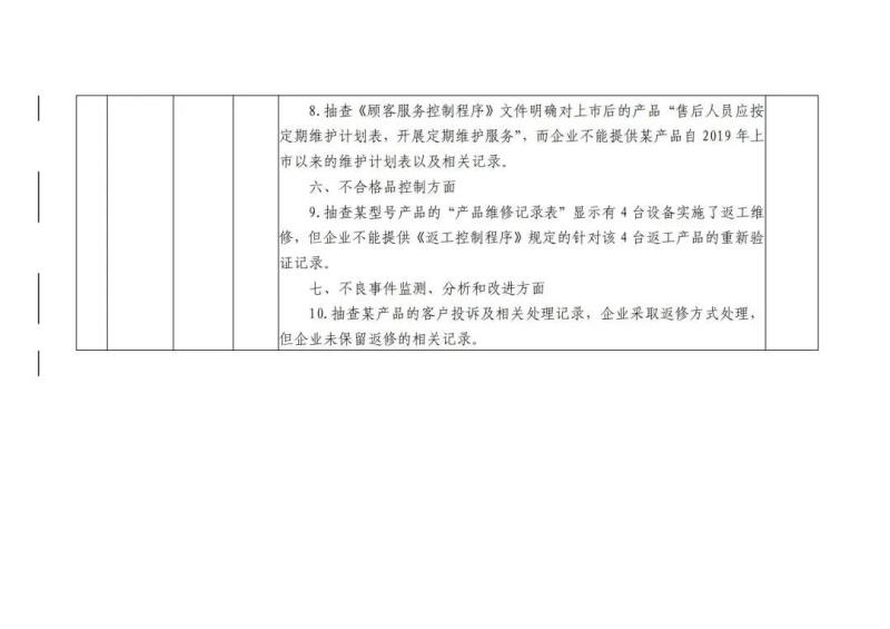 8. 抽查《顧客服務(wù)控制程序》文件明確對(duì)上市后的產(chǎn)品“售后人員應(yīng)按定期維護(hù)計(jì)劃表,開(kāi)展定期維護(hù)服務(wù)”,而企業(yè)不能提供某產(chǎn)品自2019年上市以來(lái)的維護(hù)計(jì)劃表以及相關(guān)記錄。