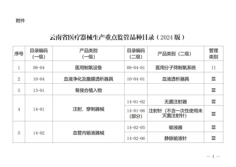 10月30日,云南省藥監(jiān)局官網(wǎng)公布《云南省醫(yī)療器械生產(chǎn)重點監(jiān)管品種目錄(2024版)》(以下簡稱《目錄》),其中包括醫(yī)用分子篩制氧系統(tǒng)、創(chuàng)面敷貼等7種Ⅱ類產(chǎn)及血液透析器具、無菌注射器等9種類產(chǎn)品?!赌夸洝?strong style="margin: 0px; padding: 0px; outline: 0px; max-width: 100%; box-sizing: border-box !important; overflow-wrap: break-word !important; visibility: visible;">自2024年1月1日起施行,以下為具體清單: