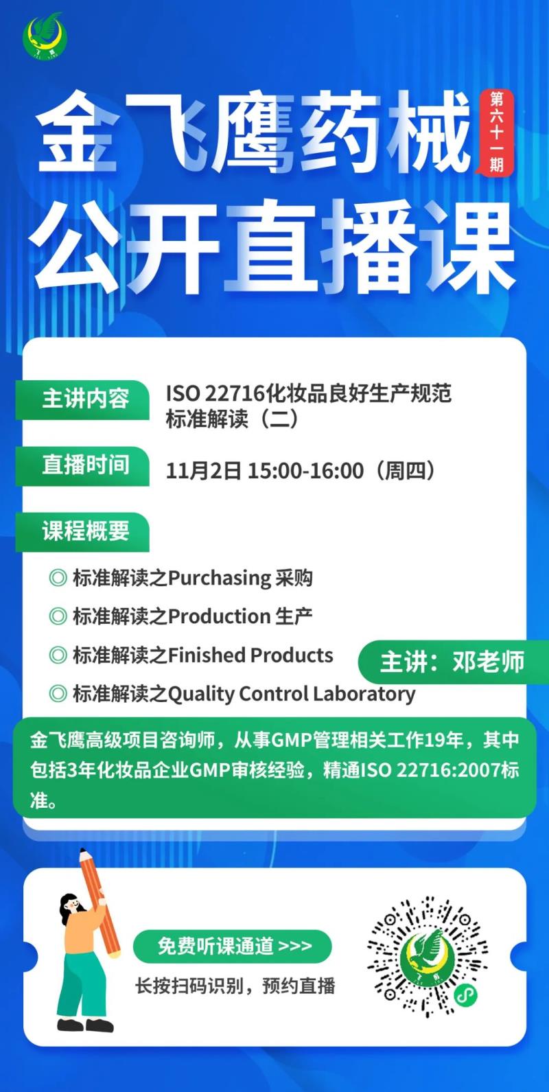 11月2日下午3點(diǎn),金飛鷹高級(jí)項(xiàng)目咨詢(xún)師,從事GMP管理相關(guān)工作19年,其中包括3年化妝品企業(yè)GMP審核經(jīng)驗(yàn)的鄧?yán)蠋煟?/span>給大家?guī)?lái)《ISO 22716化妝品良好生產(chǎn)規(guī)范標(biāo)準(zhǔn)解讀(二)》,繼續(xù)給大家詳細(xì)解讀標(biāo)準(zhǔn)的采購(gòu)、生產(chǎn)、成品、外包、投訴和召回等版塊,大家千萬(wàn)不要錯(cuò)過(guò)了哦!