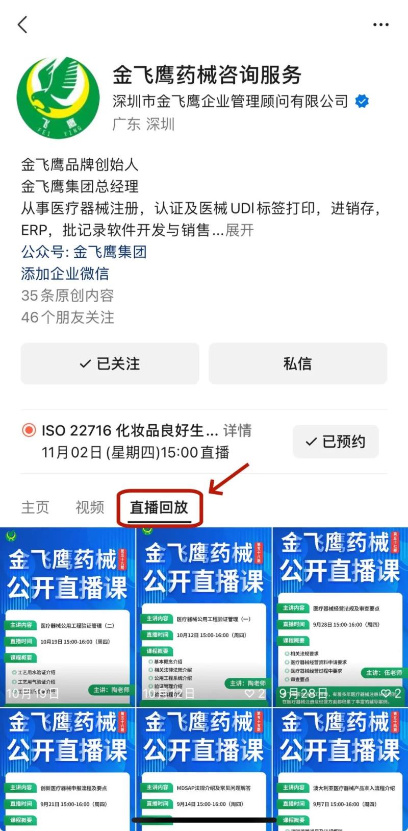 往期直播培訓(xùn)課程支持回放,關(guān)注“金飛鷹藥械咨詢(xún)服務(wù)”視頻號(hào)并點(diǎn)擊視頻號(hào)主頁(yè),即可查看“直播回放”哦~