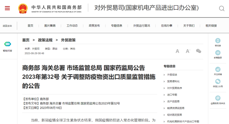 自本公告發(fā)布之日起,商務(wù)部、海關(guān)總署、國家藥監(jiān)局2020年第5號(hào)公告(《關(guān)于有序開展防疫物資出口的公告》)及商務(wù)部、海關(guān)總署、市場(chǎng)監(jiān)管總局2020年第12號(hào)公告(《關(guān)于進(jìn)一步加強(qiáng)防疫物資出口質(zhì)量監(jiān)管的公告》)同時(shí)廢止。有關(guān)防疫物資出口企業(yè)要確保產(chǎn)品質(zhì)量安全、符合相關(guān)標(biāo)準(zhǔn)要求,自覺維護(hù)中國產(chǎn)品國際聲譽(yù)。