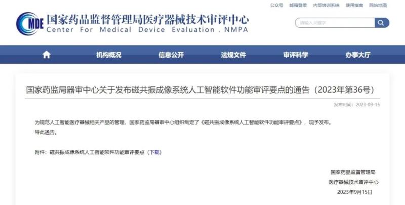 近日,國家藥監(jiān)局器審中心官網(wǎng)發(fā)布《磁共振成像系統(tǒng)人工智能軟件功能審評要點》(以下簡稱《審評要點》),我們將其中重點內容摘錄如下: