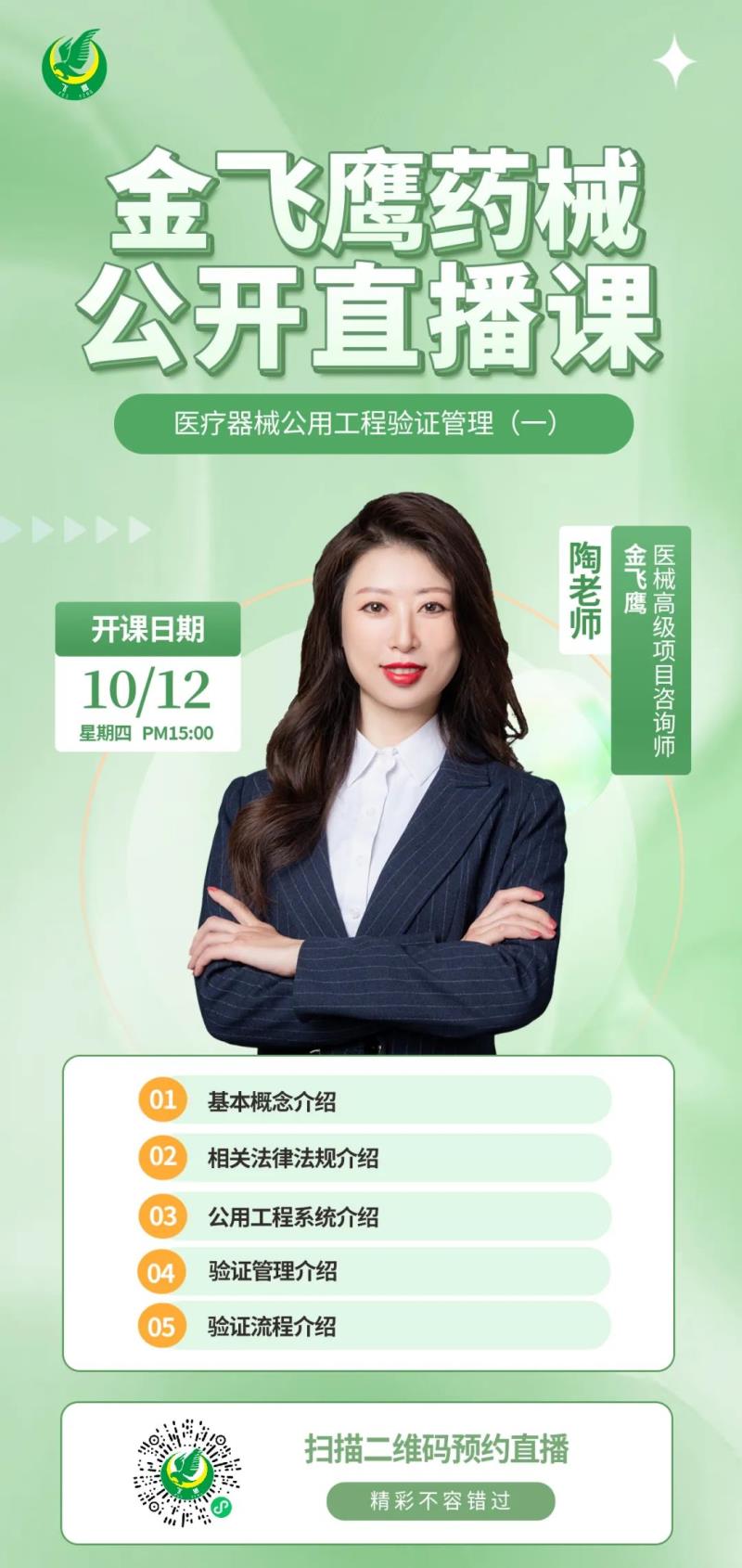 10月12日下午3點(diǎn),金飛鷹高級(jí)項(xiàng)目咨詢師,有著15年工廠管理、7年質(zhì)量經(jīng)理及廠長(zhǎng)經(jīng)驗(yàn),曾主導(dǎo)多個(gè)Ⅱ類&Ⅲ類醫(yī)療器械廠房項(xiàng)目建設(shè)的陶老師,給大家?guī)怼夺t(yī)療器械公用工程驗(yàn)證管理(一)》,培訓(xùn)內(nèi)容包括基本概念介紹、相關(guān)法律法規(guī)介紹、公用工程系統(tǒng)介紹、驗(yàn)證管理介紹、驗(yàn)證流程介紹等,大家千萬不要錯(cuò)過了哦!