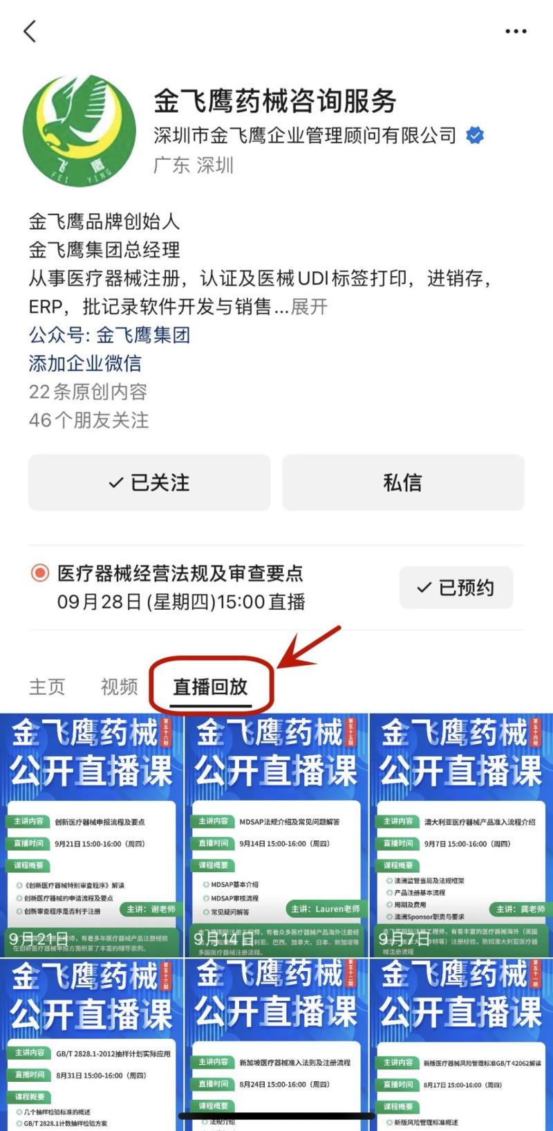 往期直播培訓(xùn)課程支持回放,關(guān)注“金飛鷹藥械咨詢服務(wù)”視頻號(hào)并點(diǎn)擊視頻號(hào)主頁(yè),即可查看“直播回放”哦~