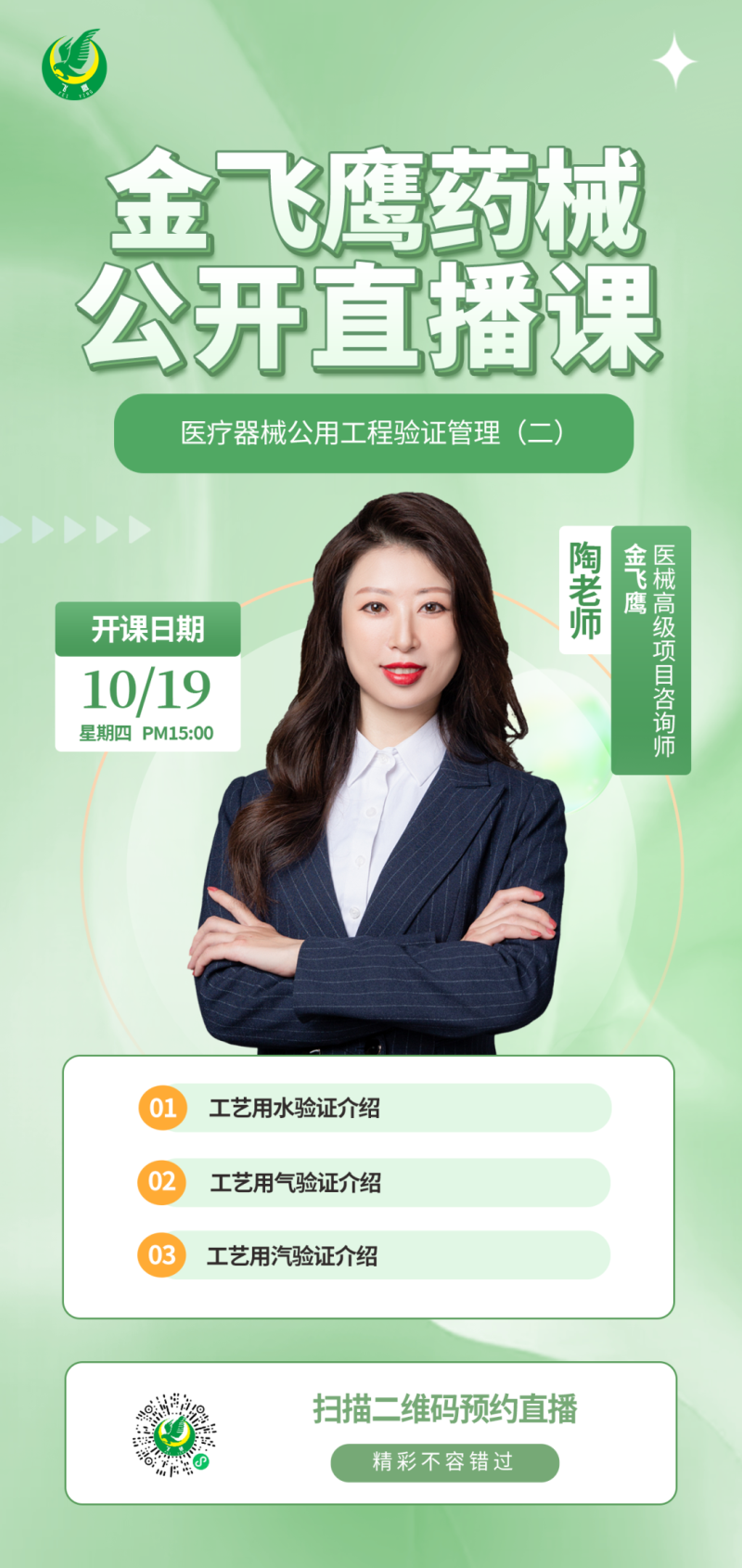 10月19日下午3點(diǎn),金飛鷹高級(jí)項(xiàng)目咨詢師,有著15年工廠管理、7年質(zhì)量經(jīng)理及廠長(zhǎng)經(jīng)驗(yàn),曾主導(dǎo)多個(gè)Ⅱ類&Ⅲ類醫(yī)療器械廠房項(xiàng)目建設(shè)的陶老師,繼續(xù)給大家?guī)?/span>《醫(yī)療器械公用工程驗(yàn)證管理(二)》,培訓(xùn)內(nèi)容包括工藝用水驗(yàn)證介紹、工藝用氣驗(yàn)證介紹、工藝用汽驗(yàn)證介紹等,大家千萬不要錯(cuò)過了哦!