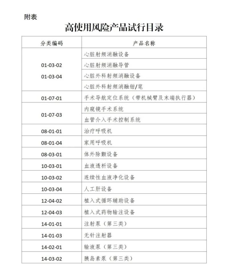 一、對于擬申請注冊的醫(yī)療器械產品,高使用風險醫(yī)療器械按照目錄(詳見附件,均為第三類醫(yī)療器械)管理,列入目錄的產品提交可用性工程研究報告。對于其余第二、三類醫(yī)療器械,若相應產品指導原則有可用性或可用性相關要求(如模擬使用等),則按其要求提交相應注冊申報資料;其他情況均按照中、低使用風險醫(yī)療器械要求提交使用錯誤評估報告。