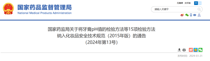 近日,國(guó)家藥監(jiān)局發(fā)布了關(guān)于將牙膏pH值的檢驗(yàn)方法等15項(xiàng)檢驗(yàn)方法納入《化妝品安全技術(shù)規(guī)范(2015年版)》的通告(2024年第13號(hào))