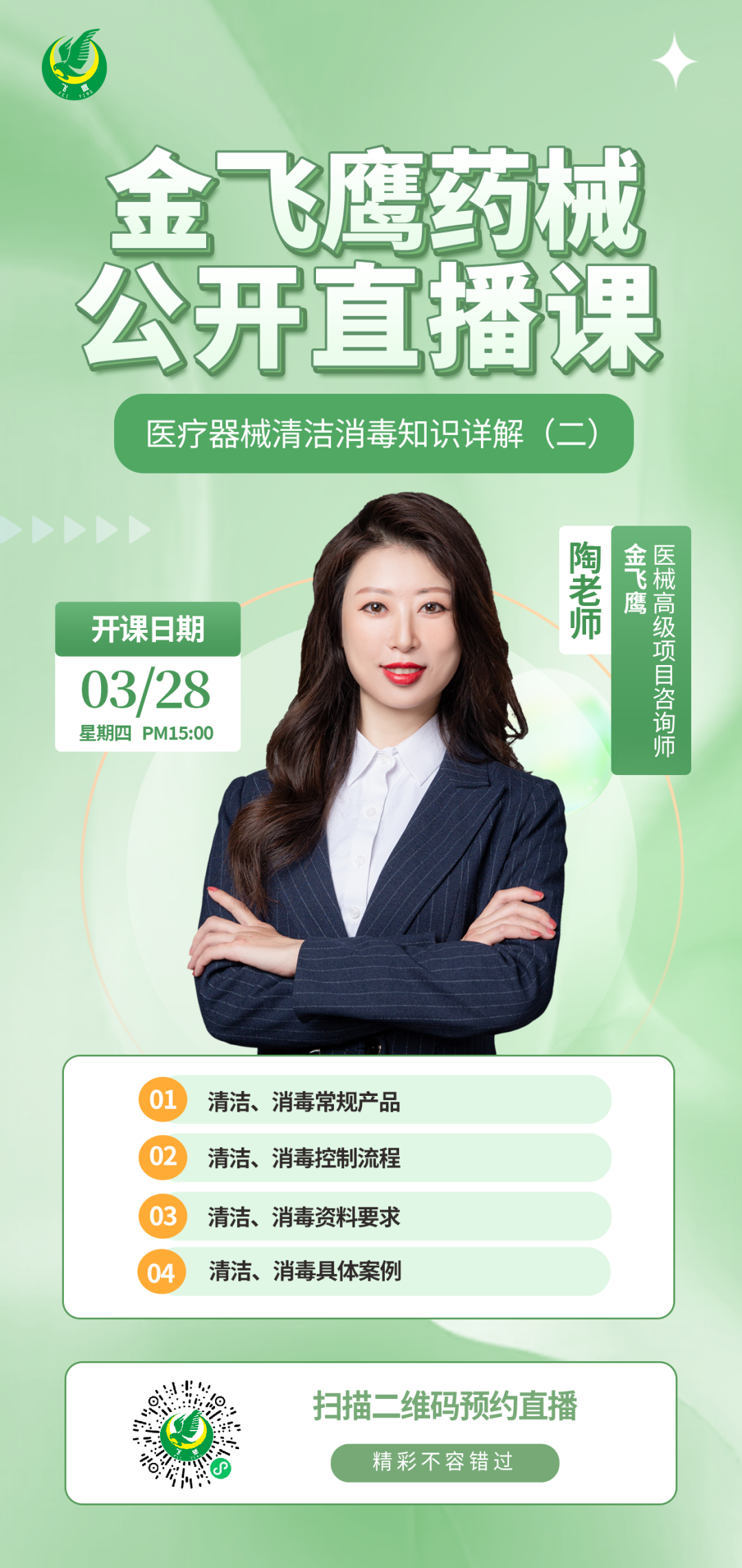 3月28日下午3點(diǎn),金飛鷹高級(jí)項(xiàng)目咨詢師,負(fù)責(zé)過(guò)多種無(wú)菌和植入耗材類醫(yī)療器械產(chǎn)品國(guó)外委托生產(chǎn)&國(guó)內(nèi)技術(shù)轉(zhuǎn)移項(xiàng)目,對(duì)醫(yī)療器械消毒滅菌頗有研究的陶老師,繼續(xù)給大家?guī)?lái)《醫(yī)療器械清潔消毒知識(shí)詳解(二)》,培訓(xùn)內(nèi)容包括清潔/消毒常規(guī)產(chǎn)品、清潔/消毒控制流程、清潔/消毒資料要求、清潔/消毒具體案例等,大家千萬(wàn)不要錯(cuò)過(guò)了哦!