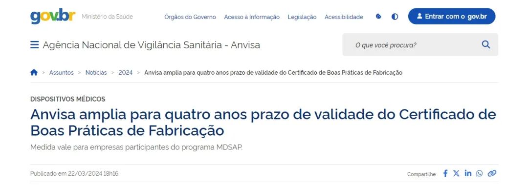 近日,Anvisa發(fā)布RDC 850/2024號決議,正式將通過MDSAP授予醫(yī)療器械制造商的BGMP證書有效期從兩年延長至四年。條件是制造商在整個證書有效期內(nèi)都必須繼續(xù)參與MDSAP。