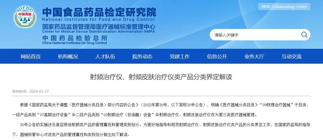 隨著這一監(jiān)管日期的臨近,3月27日,國(guó)家藥監(jiān)局醫(yī)療器械標(biāo)準(zhǔn)管理中心對(duì)射頻治療儀、射頻皮膚治療儀類(lèi)產(chǎn)品的管理屬性和類(lèi)別劃分做出解讀,具體如下: