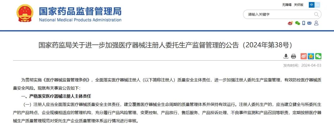 4月3日,國(guó)家藥監(jiān)局發(fā)布《關(guān)于進(jìn)一步加強(qiáng)醫(yī)療器械注冊(cè)人委托生產(chǎn)監(jiān)督管理的公告(2024年第38號(hào))》,具體內(nèi)容如下: