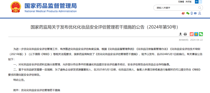 近日,國(guó)家藥監(jiān)局制定了《優(yōu)化化妝品安全評(píng)估管理若干措施》用于優(yōu)化化妝品安全評(píng)估管理,自2024年5月1日起施行。允許部分符合條件的普通化妝品提交安全評(píng)估基本結(jié)論,安全評(píng)估報(bào)告由化妝品企業(yè)存檔備查。