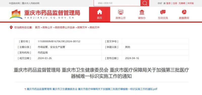 重慶藥監(jiān)局:加強(qiáng)第三批醫(yī)療器械唯一標(biāo)識(shí)實(shí)施工作