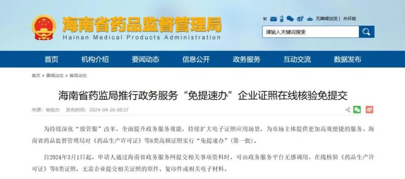 自2024年3月1日起,申請(qǐng)人通過(guò)海南省政務(wù)服務(wù)網(wǎng)提交相關(guān)事項(xiàng)資料時(shí),可由政務(wù)服務(wù)平臺(tái)無(wú)感調(diào)用、在線核驗(yàn)《藥品生產(chǎn)許可證》等8類證照,無(wú)需企業(yè)提交相關(guān)證照的原件、復(fù)印件或相關(guān)電子材料。